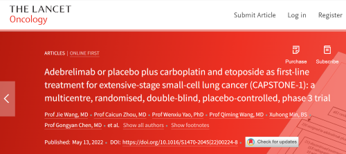 北京时间2022年5月14日,尊龙凯时医药自主研发的PD-L1抑制剂阿得贝利单抗治疗广泛期小细胞肺癌的III期临床研究(CAPSTONE-1研究)成果正式全文在线发表于国际权威学术期刊《柳叶刀·肿瘤学》(《THE LANCET Oncology》,影响因子41.316)。CAPSTONE-1研究结果显示,阿得贝利单抗联合化疗一线治疗广泛期小细胞肺癌相较于安慰剂联合化疗可以显著延长患者总生存期至15.3个月[1],刷新现有免疫药物一线治疗广泛期小细胞肺癌的总生存纪录[2]。